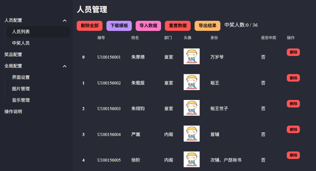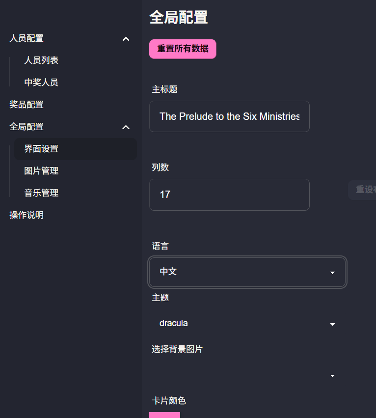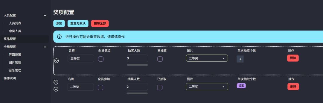 页面上可直接配置人员信息、奖项奖品、背景音乐、主题界面等